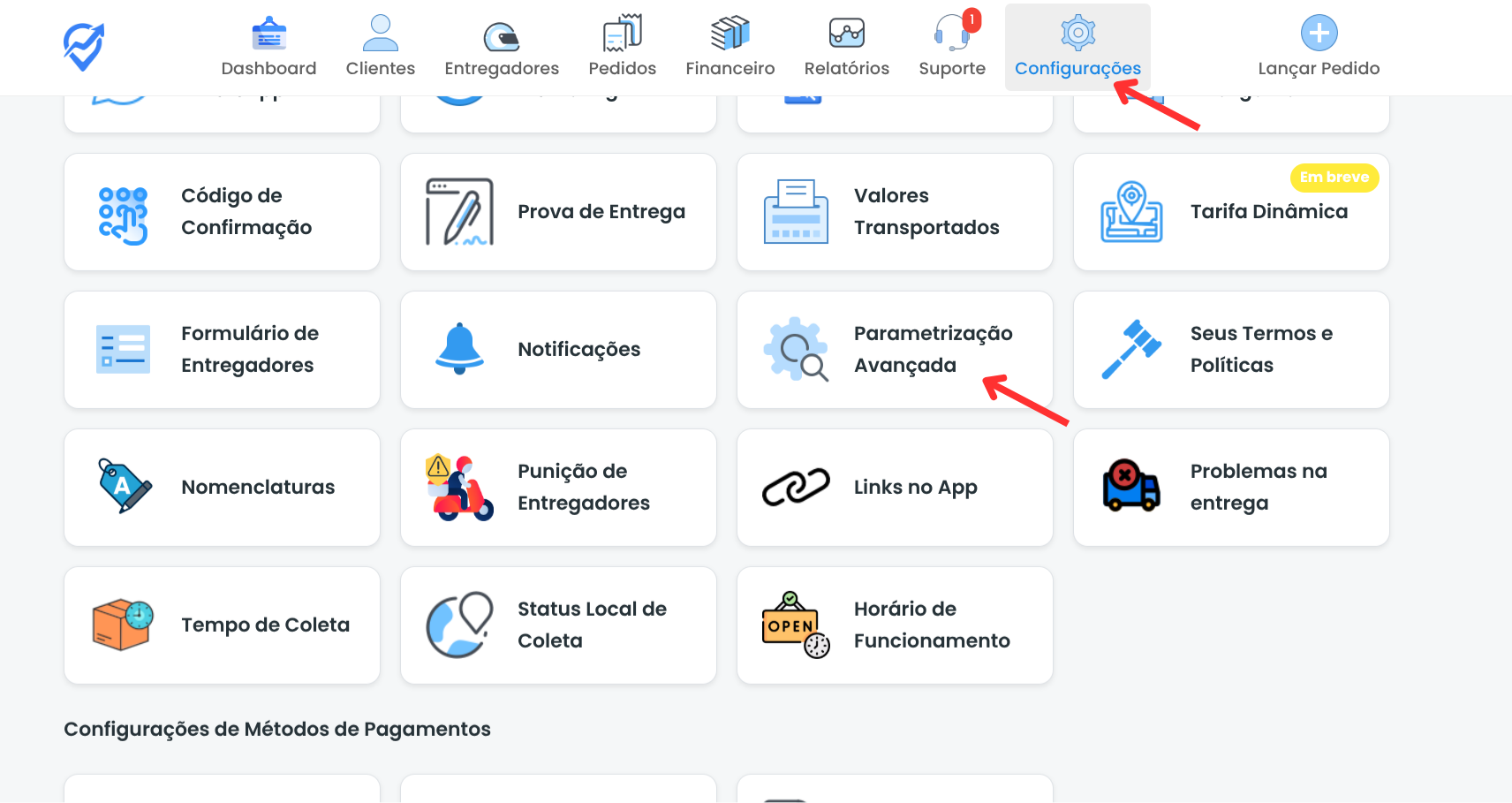 A tela de Parametrização Avançada permite configurar opções específicas de visualização e comportamento do sistema de entregas.