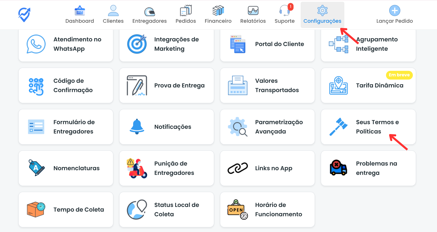 Nesta página você pode configurar os termos legais da sua plataforma de entregas. Acesse em: Configurações > Seus termos e politicas