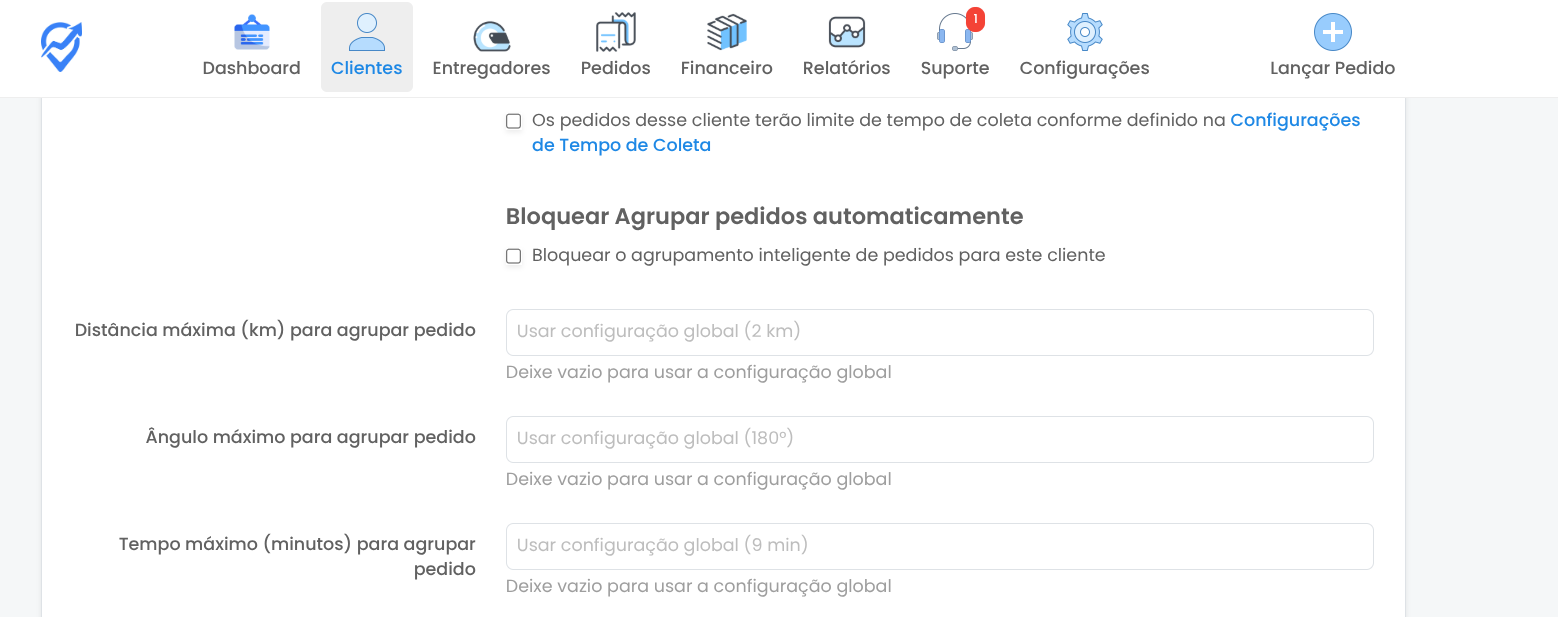 Agrupar pedidos automaticamente — Habilita o agrupamento inteligente especificamente para este cliente (Somente vai ser mostrado quando a configuração global está desativada).