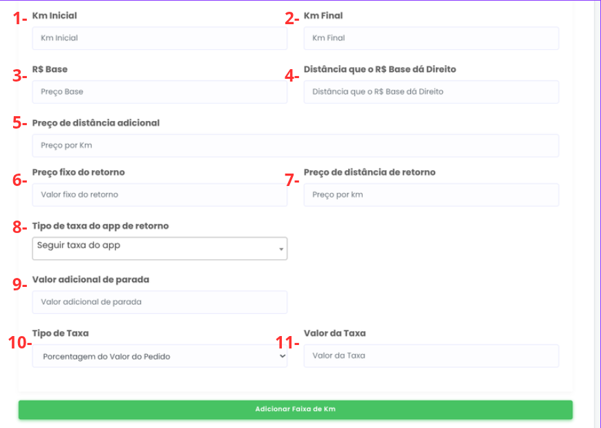 Após preencher as informações da faixa, clique em Adicionar faixa de Km para criar uma nova faixa. É obrigatório definir faixas de preço até pelo menos 15 km.