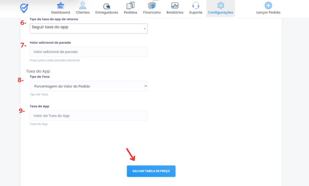 Dentro de todas as tabelas, você pode definir um valor a ser descontado de comissão por cada entrega e também precificar caso o pedido tenha retorno.