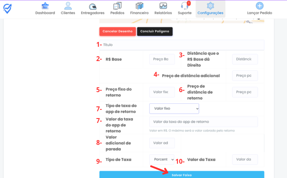 Após todas as definições, clique em Salvar Faixa. Para criar novas áreas, repita o processo antes de salvar a tabela. Clique em Salvar tabela de preços para finalizar.
