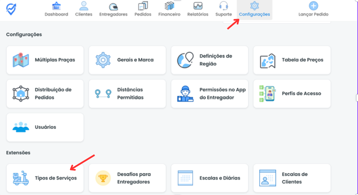 Em seu painel administrativo, selecione Configurações e abra o menu Tipos de serviço.