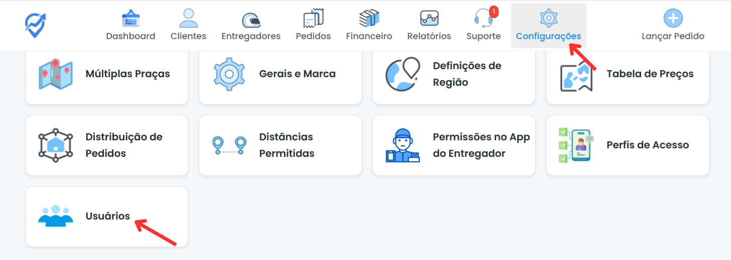 No painel administrativo, vá em Configurações e selecione Usuários: