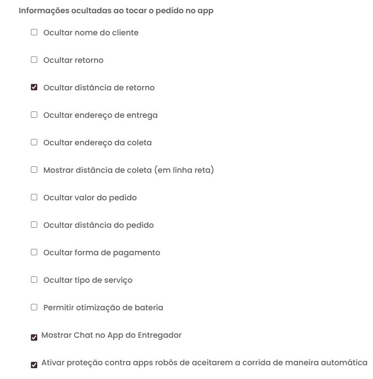 Dentro do seletor você tem varias configurações que pode escolher ocultar. Vale lembrar que as informações são ocultar somente ate antes do entregador aceitar o pedido, apos aceito, todas as informações ocultas vão aparecer para o entregador.