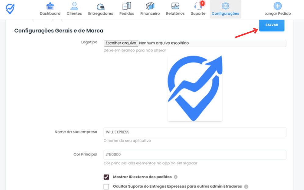 Mostrar ID externo dos pedidos Ocultar Suporte do Entregas Expressas para outros administradores | Quando marcado, exibe o ID externo dos pedidos (útil quando há integrações com outros sistemas). Quando habilitado essa função vai limitar o acesso do chat de suporte tecnico com nosso time somente ao administrador master |